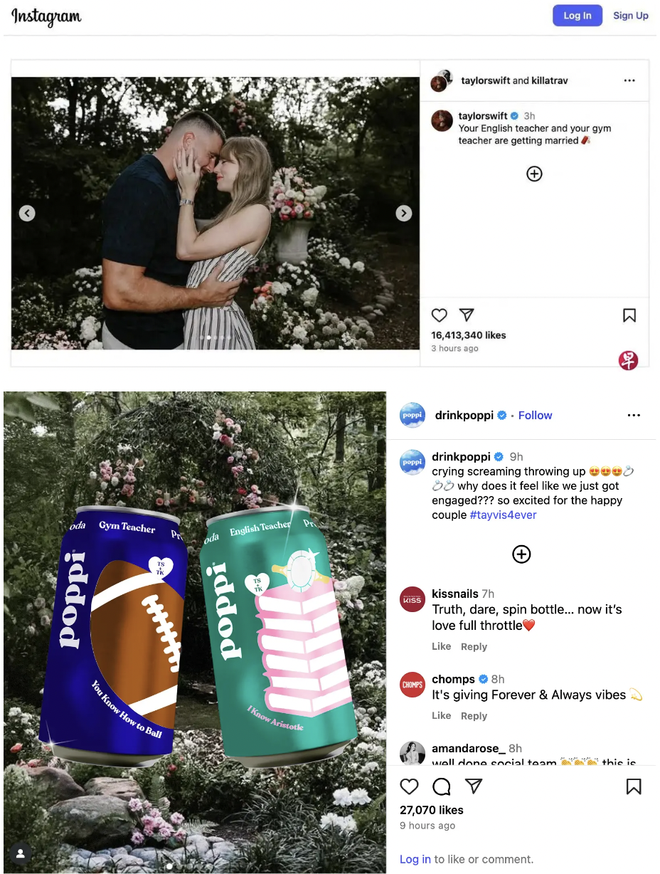 美国各大品牌已经开始蹭热点了。益生菌汽水品牌 Poppi 分享了一张两罐饮料的图片——分别印着“体育老师”和“英语老师”的标签,以此致敬这对情侣在Instagram上的配文——图片叠加在两人订婚照的花卉背景上;经期护理品牌 Lola 用斯威夫特的大写歌词配文“爱他是红色的”。