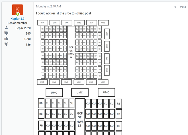 AT2,拥有4个着色器阵列 / 8个着色引擎(每组着色器阵列有2个着色引擎)/ 40个CU(每个着色引擎有6个CU)/ 位宽192-bit(6个32-bit显存控制器)/ Infinity Cache预计为48MB。