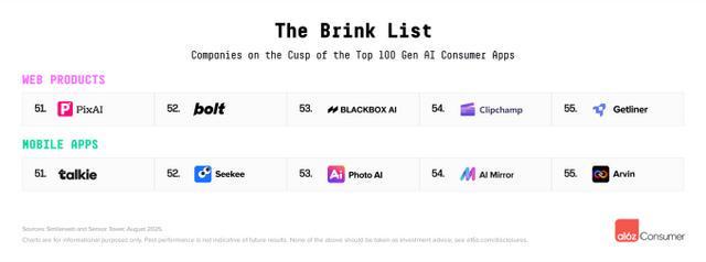 Andreessen Horowitz 还花时间列举了即将跻身顶级 AI 应用程序榜单的 AI 应用程序,包括网络上的 PixAI、Bolt、Blackbox AI、Clipchamp 和 Getliner,以及移动设备上的 Talkie、Seekee、Photo AI、AI Mirror 和 Arvin。