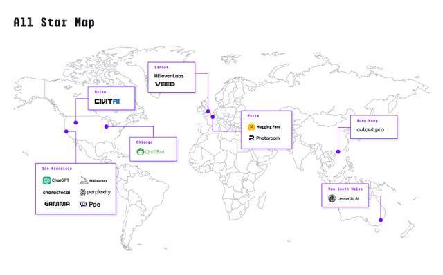 14 家公司第五次出现在顶级 AI 产品榜单上:ChatGPT、Perplexity、Poe、Character AI、Midjourney、Leonardo、Veed、Cutout、ElevenLabs、Photoroom、Gamma、QuillBot、Civitai 和 Hugging Face。