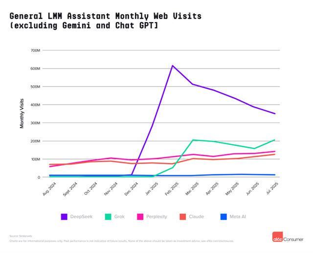 DeepSeek和 Claude 在移动端的增长也趋于平缓,前者从峰值下降了22%。在网页端,DeepSeek 的下降幅度更大,较 2025 年 2 月的峰值下降了 40% 以上。然而,Perplexity 和 Claude 仍在继续增长。