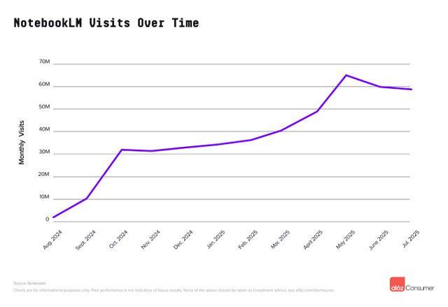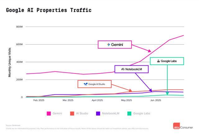 该公司的 AI Studio 是一款面向开发人员的沙箱,用于使用 Gemini 模型进行构建,进入了十大 AI 网络产品榜单,位居第十位;NotebookLM 排名第十三。Google实验室是Google AI 实验(例如 Flow、Project Mariner 和 Doppl)的目的地,排名第 39 位。