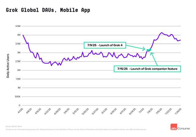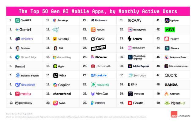 Grok 在网页端排名第四,移动端排名第23。考虑到 Grok 从 2024 年底(最初在 X 平台上发布)没有独立应用到如今每月拥有超过 2000 万活跃用户,这样的增长速度可谓相当迅速。2025 年 7 月, Grok 4 发布后,Grok 的用户增长了近 40% 。