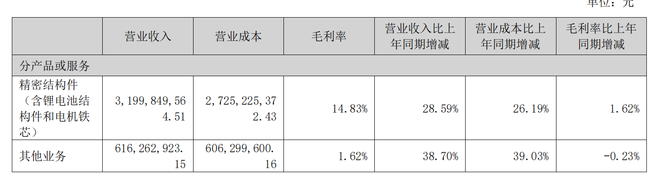 数据显示,上半年,震裕科技精密结构件(含锂电池结构件和电机铁芯)实现营收32.00亿元,同比增长28.59%,占总营收比达79.07%。此外,整体毛利率水平比去年同期提高1.62个百分点。