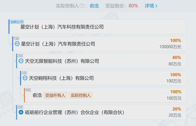 今年1月,星空计划(上海)汽车科技责任有限公司成立,注册资本为10亿元,总部位于上海临港新片区。俞浩间接持股80%,为公司的最终受益人和实际控制人。