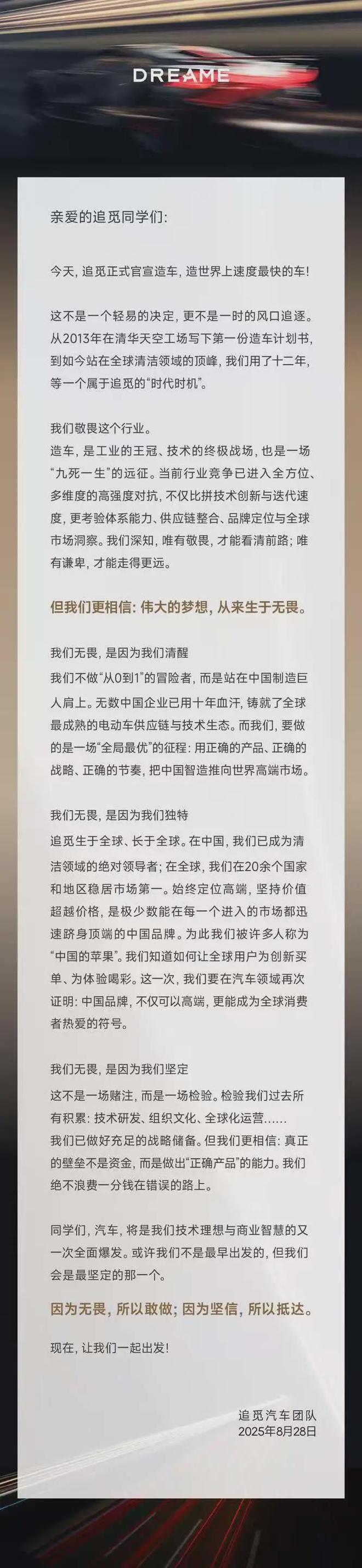 追觅汽车团队当天发的内部信表示,造车并非一时冲动,早在2013年就有造车计划书,历经十二年在清洁领域登顶后,迎来“时代时机”。
