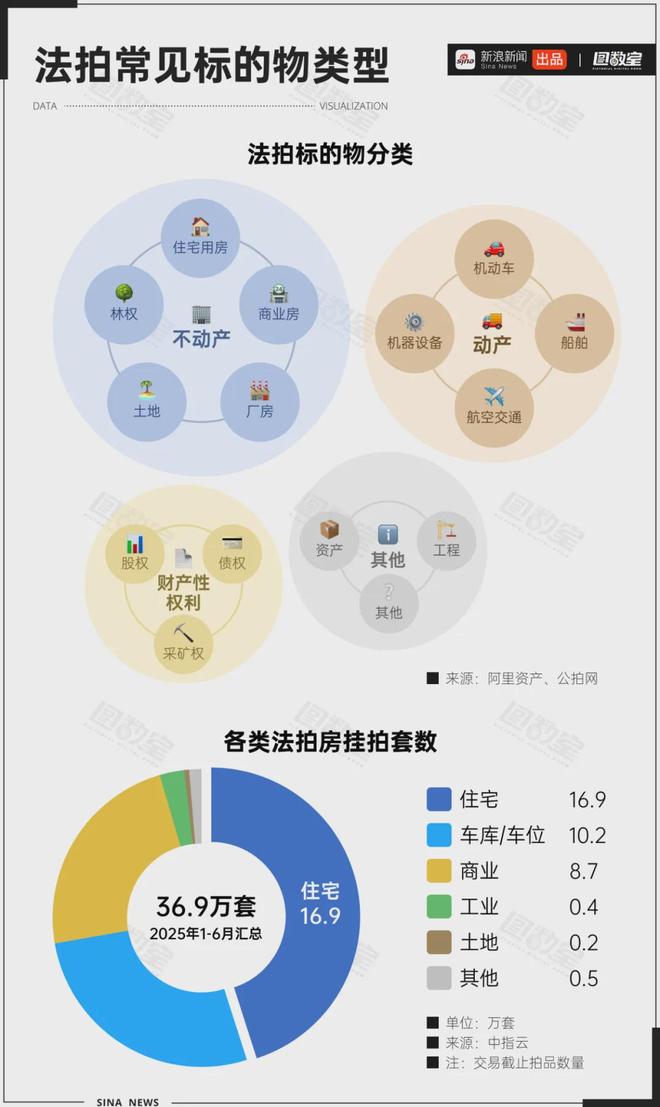 事实上,常见的法拍标的物,包含不动产、动产,甚至财产性权利、工程等等。其中以不动产居多,2025年1-6月,全国法拍房共计挂牌36.9万套,其中住宅16.9万套,占比超过45%。