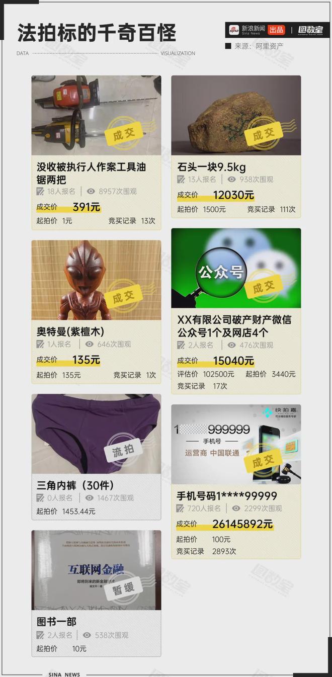 比如,两把没收的作案工具“惊魂油锯”,1元起拍,竞拍13次后以391元成交,至于买走干啥用,咱也不敢问;一本崭新未开封的《互联网金融》,仿佛暗示了原主人被执行法拍的原因;还有30件紫罗兰色三角内裤,引来1467人围观,最终无人出价,三次流拍;还有裂缝中闪着绿光石头、紫檀木奥特曼……恍惚间让人以为闯进了潘家园。