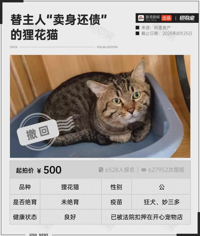 8月22日,猫猫的拍卖信息已经从拍卖平台上撤销,原因是“申请执行人及其他执行债权人撤回执行申请”。据广州日报报道,债权人已经把狸花猫交给一位爱猫人士抚养,结束了它的“牢狱之灾”。