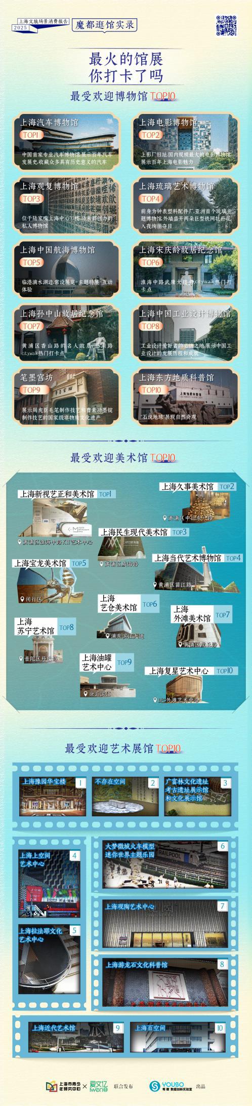 上海汽车博物馆、上海电影博物馆、上海观复博物馆、上海琉璃艺术博物馆、上海中国航海博物馆位列最受欢迎博物馆Top5。上海新视艺正和美术馆、上海久事美术馆、上海民生现代美术馆、上海当代艺术博物馆、上海宝龙美术馆为最受欢迎美术馆Top5。上海豫园宝华楼、不存在空间、广富林文化遗址考古遗址展示馆和文化展示馆、上海上空间艺术中心、上海拉法耶文化艺术中心为最受欢迎艺术展馆Top5。(以上统计均未包含上海博物馆消费数据)