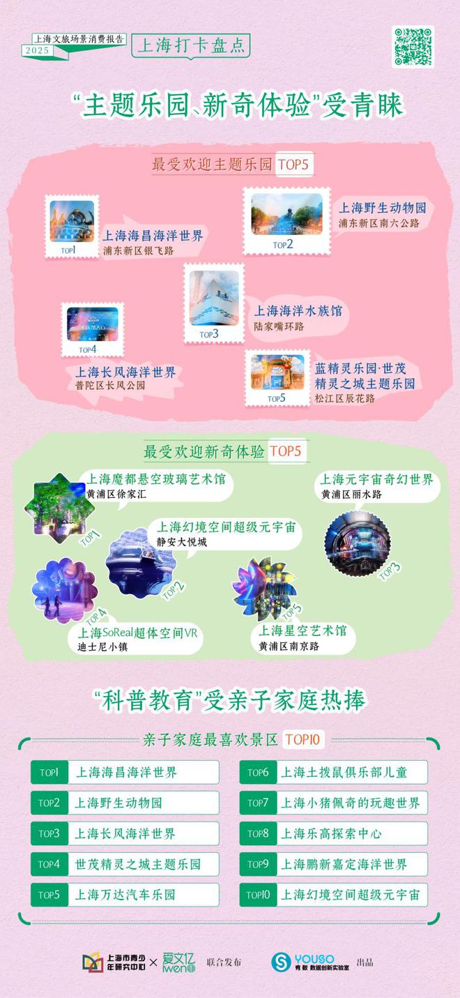 上海热门演艺、沉浸剧场、新奇体验、都市乐园等新型文化消费场景多元、分布密集,高浓度、高迭代的文旅供给生态覆盖年轻人社交打卡、情绪价值、仪式感等"悦己"诉求。从空间到体验的"无缝衔接"持续为城市"圈粉",更是掀起了"入沪连打"等文化消费新潮流。本篇运用爱文亿《畅游上海景区》消费数据分析得出。