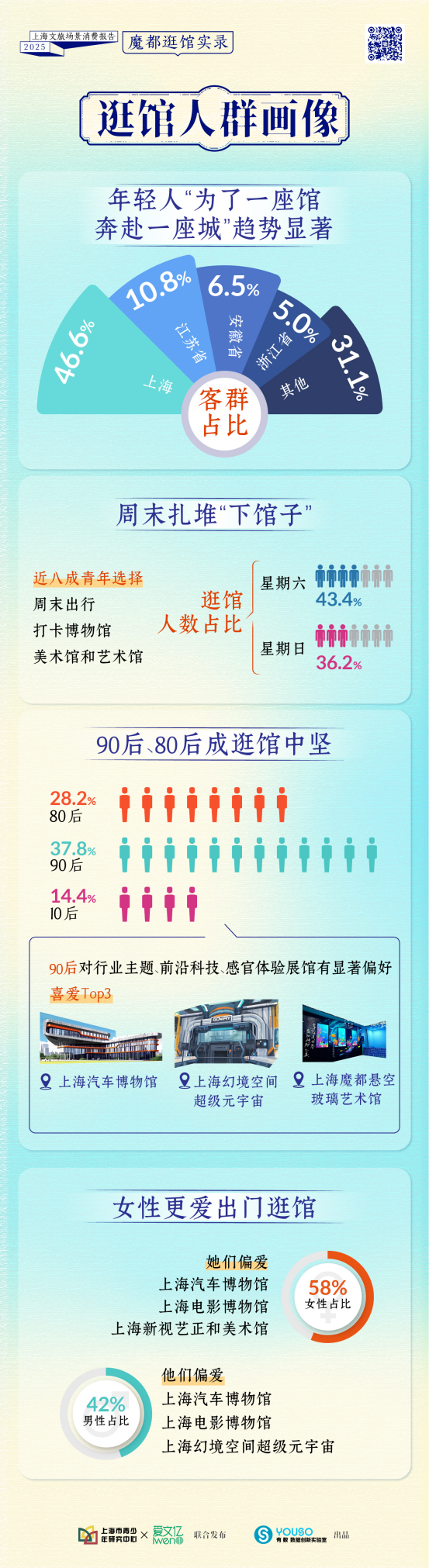 日前,上海市青少年研究中心联合爱文亿发布《2025上海文旅场景消费报告》,报告由《魔都逛馆实录》与《上海打卡盘点》组成,关注年轻人以文博场馆为承载的"体验"消费、以演艺经济为代表的"悦己"消费崛起趋势。报告显示,年轻人文旅消费正从传统功能满足向追求情绪价值与个性表达的代际需求跃迁。