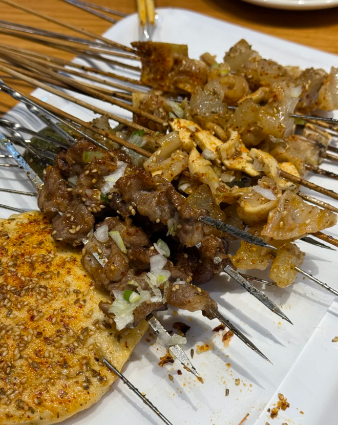 东北烧烤和江苏一样,外人看来是一个整体,东北人眼里是泾渭分明的散装。鹤岗小串自成体系,特点首先是小,所以价格低,肉皮5毛一串,小牛肉1块5。鹤岗小串最出名的是“三分熟”,鲜切的牛肉在炭火上快速翻转20秒,牛肉微微夹生,嫩得恰到好处。鹤岗小串的特点被解释为“原味烧烤”,更考验肉的品质和烧烤师傅的技巧。