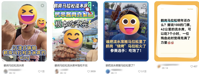 当然,不只是鹤岗在等待着泼天流量的再次降临,小城们随时准备着争夺着下一批注意力。9月,铁岭市将举行新一届流水席马拉松,赛事组委会宣布这次马拉松准备了132种东北特色美食,包括铁岭火勺、大甸子羊汤、米肠大酱汤、云朵酥、烤地瓜、锅包肉、大肘子、烤冷面、雪绵豆沙,比去年多了86道菜。