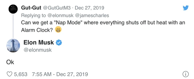 2020年特斯拉上线了“打盹模式”,允许车主在打开气候控制系统的时候能在车上睡觉;同年,还没更名为创维汽车的天美汽车,推出首款电动SUV,就把号称“全球首创的一键午休模式”当成主要卖点,安装负离子净化器,车座还自带航空枕头;2021年小鹏P5也增加了“睡眠空间”的车型选项,并免费送充气床垫。