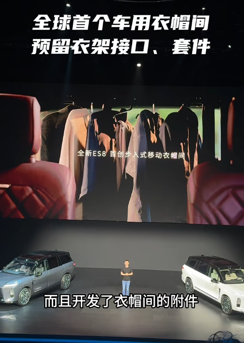 有意思的是全新ES8首创“步入式移动衣帽间”,第三排座舱拉上“预留原生衣帽架接口”,只需拉上晾衣绳或装上挂衣杆,车就变成了更衣室。