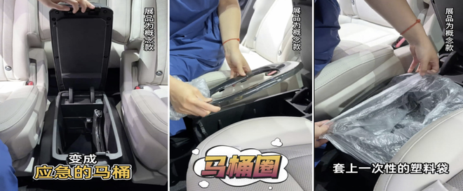 还得是极石,2024年9月,昌敬发视频展示“车载马桶”。这个马桶,实际上是一个中岛储物盒,但特别着急的时候,可以把里面收纳的折叠马桶圈拿出来装上,再套上一次性塑料袋,放入除臭和吸水凝胶,储物盒就摇身一变成了应急马桶。
