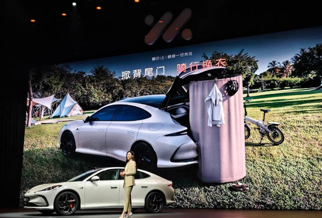 典型代表如2024年5月上市的智己L6,主打“大开口掀背式尾门+超大容量后备箱”,靠“能装”讨户外爱好者的欢心。爱钓鱼的能把鱼竿和狗都捎上;爱露营的能一口气装下露营车、天幕、帐篷、吊床、野餐垫,到地儿了在后备箱挂几盏灯,露天野奢咖啡馆初具雏形;爱骑行的不仅能装着自行车到处走,后备箱门掀起来再挂个帘子还能充当更衣室。