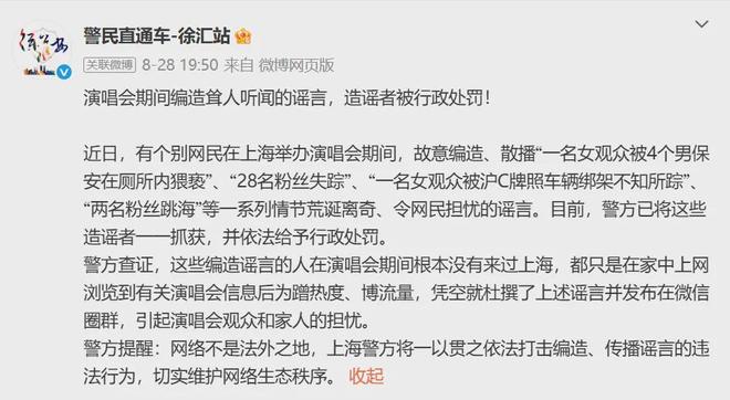 8月28日,上海徐汇警方经查证后表示,编造谣言的人在演唱会期间根本没有来过上海,都只是在家中上网浏览到有关演唱会信息后为蹭热度、博流量,凭空杜撰谣言发布在微信圈群,目前已将造谣者一一抓获并依法给予行政处罚。