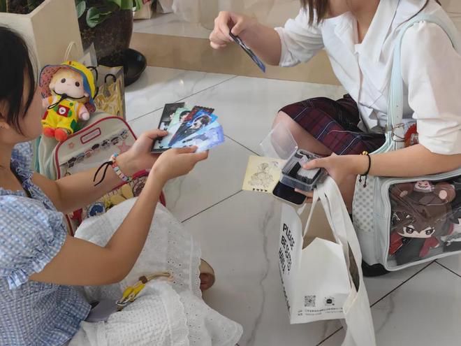 小黄表示,她们当中很多人都提前一两个月准备设计物料,不仅有基础的小卡、贴纸、明信片、海报、发夹,还有nfc芯片识别放音乐的黑胶唱片和小CD。有一名16岁的粉丝依照团粉“爆米花”的设定和每个成员的风格学做香薰蜡烛,光是采购8款大牌香氛原料就花了近3000元。大家都穿着漂亮的小裙子,三两成群很快熟络起来,彼此交换自制周边。