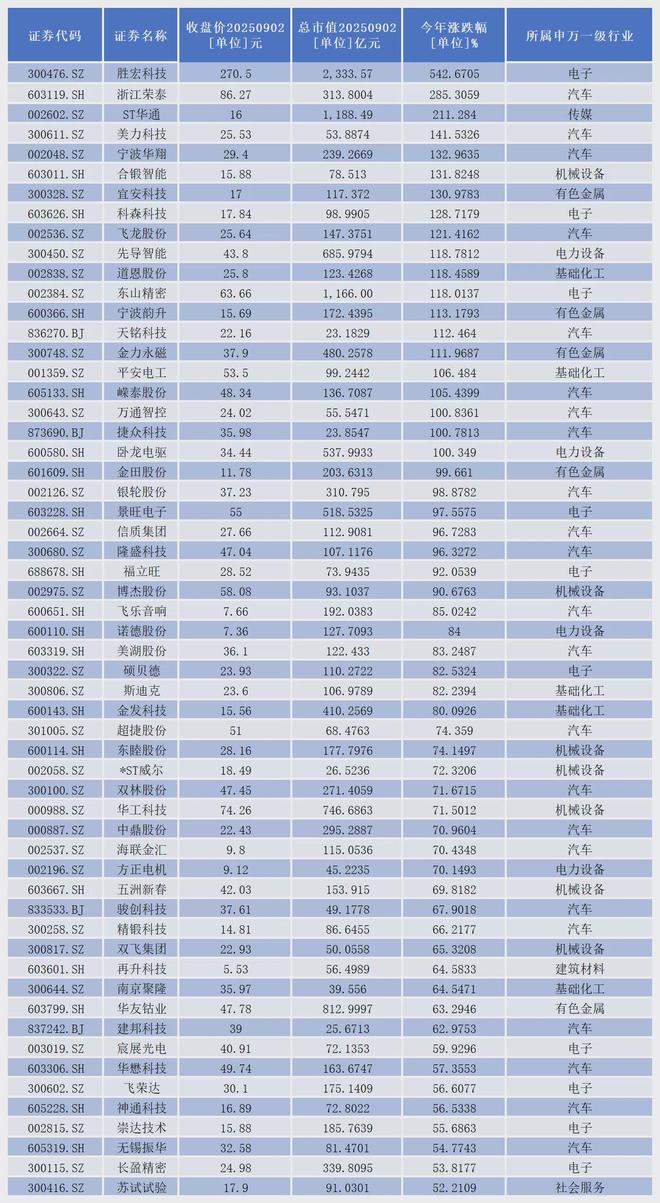 其中,胜宏科技、浙江荣泰、ST华通、美力科技、宁波华翔、合锻智能、宜安科技、科森科技、飞龙股份、先导智能、道恩股份、东山精密、宁波韵升、天铭科技、金力永磁、平安电工、嵘泰股份、万通智控、捷众科技、卧龙电驱等20家上市公司股价已经成功实现翻倍。