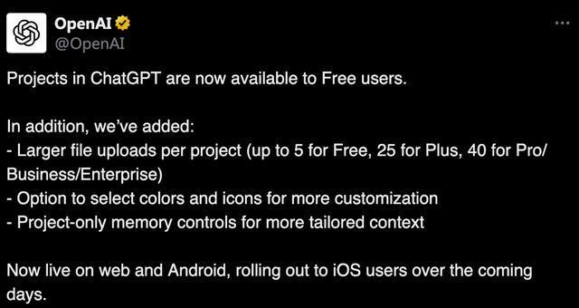 OpenAI宣布免费用户可访问ChatGPT项目功能