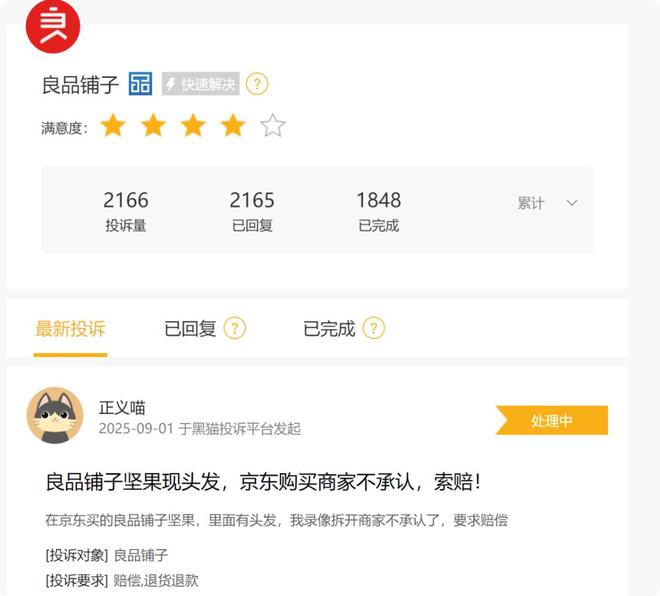 黑猫投诉显示良品铺子累计投诉超过2000条,基本都是产品质量问题。