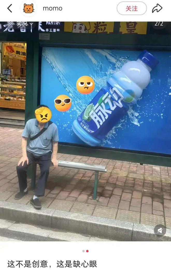 达能旗下饮料品牌脉动在全国多地公交站台投放的3D立体户外广告引发争议。该广告以巨型脉动饮料瓶身造型呈现,瓶身高度超过1.5米,凸出部分超过30厘米,因挤占公共空间、影响市民休息和存在安全隐患。