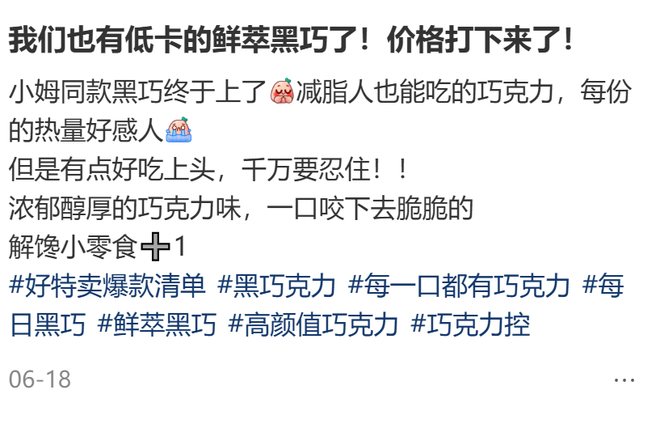 当然,以上线索不能实锤好特卖选品和山姆有啥猫腻?不过最近好特卖官方也不装了,在社交媒体里直接宣传自己的鲜萃巧克力是“小姆同款”,还特意强调“价格打下来了”。