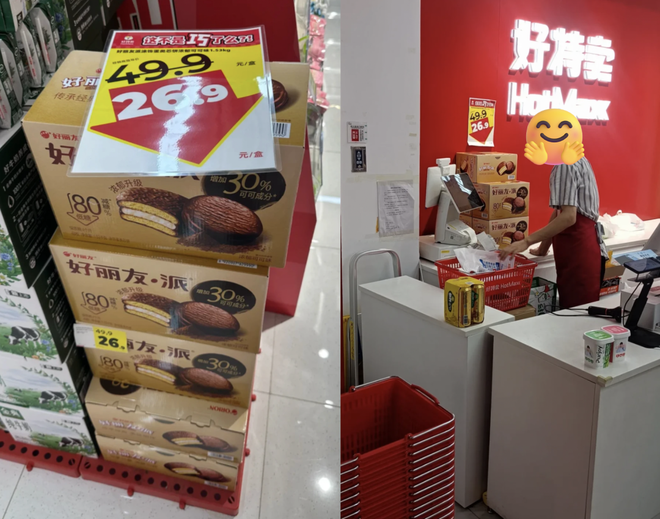 先是在好丽友的价标旁边写上一句“这不是巧了么?”后来就开始变本加厉地阴阳怪气,”260约等于9盒;680约等于25盒”;没多久,专门来买好丽友派的人多了,好特卖干脆把好丽友派不无骄傲地放在了收银台旁边,让你一进门就能看见。