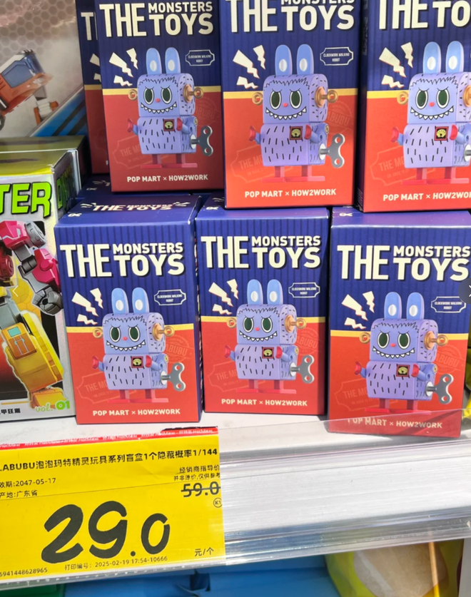 秉持着啥火卖啥的基本原则,过气网红集散地的好特卖里,也能看到曾经辉煌一时的各大IP盲盒。2块9的排球少年,3块9的蜡笔小新,以及29一个的labubu——开出隐藏款的概率是1:144。只是出现在好特卖的labubu都是古早款,“二手平台上10多块也能买一个”。