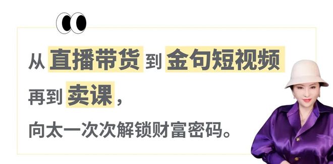 而今天的向上“触达”贵人,不用盛装出席更不用掏空钱包,只需399元,就能“私享圈层特权”,并且“链接高质量圈层网络”。从直播带货到金句短视频再到卖课,向太一次次解锁财富密码。