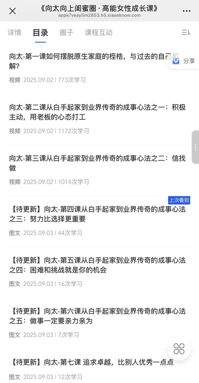 向太的向上课程目前已经上线三节录播课,单节课10-20分钟左右。向太先是从原生家庭讲起,并分享了两套成功学理论“用老板的心态打工”“信找做”。就像你学过的许多技能入门课程,第一章讲综述,紧接着阐述理论,最后用大堆案例验证理论。截止目前,课程表上又出现了四节待更新课程。