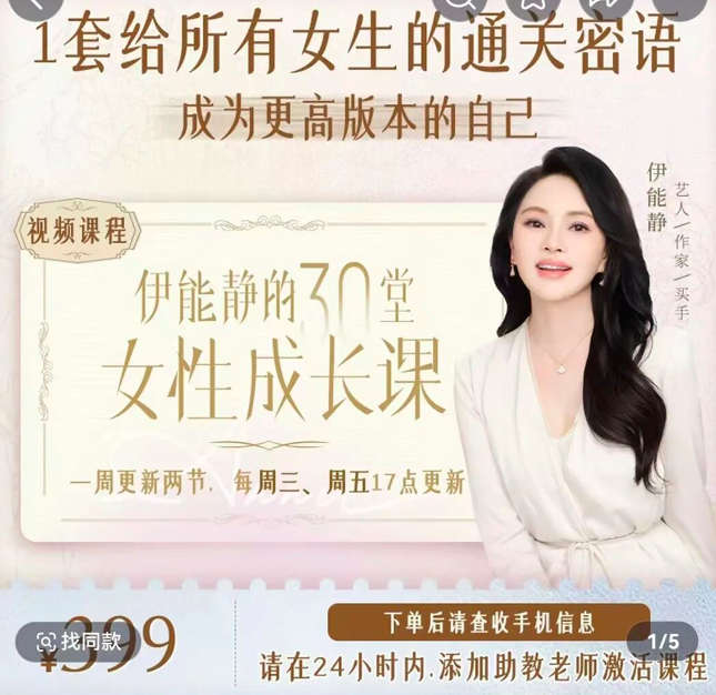 到了今年,另一位金句女王伊能静比向太更早布局卖课领域,推出同样399元售价的《伊能静的30堂高能量女性成长课》,主打帮助你获得更好的人生。