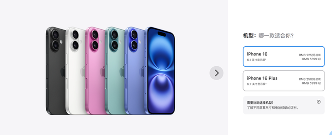 现在在苹果官网上,仅提供128GB和256GB版本的iPhone 16与iPhone 16 Plus(512GB版本已下架),定价分别为人民币5399元起和人民币5999元起。