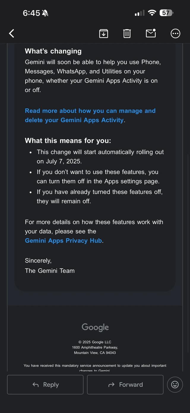 Google消息措辞模糊,最初引发了一些疑惑,人们不禁质疑这项变更是否会让 Gemini 获得不受限制的私人数据或系统功能访问权限。Google随后澄清称,Gemini 的应用连接仍然可以随时禁用,且此次更新“对用户有利”。