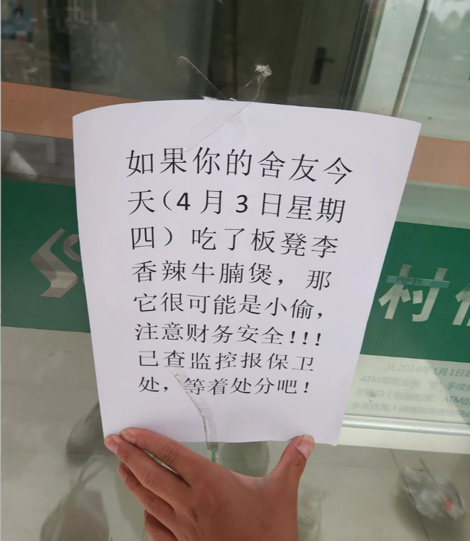 一份外卖二三十块,大多数学生选择不了了之,即使找到了偷外卖的人,也大多终结于一句“拿错了”。于是大学生入学第一课是《没外卖柜如何守住午饭》,高年级学生则使出各种招数捍卫自己的外卖,包括钓鱼执法、蹲守抓捕、监控查证、标语威胁。