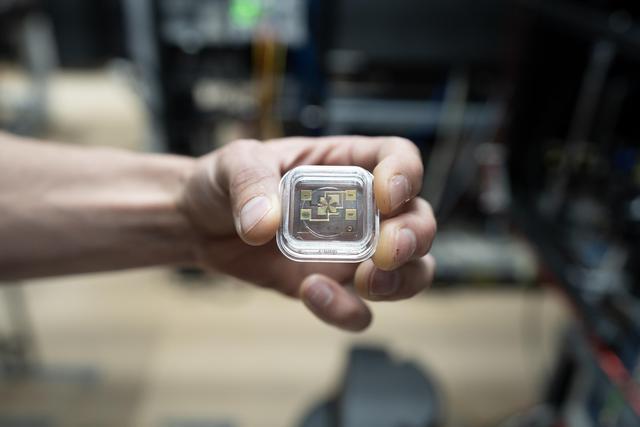 美国国家标准与技术研究院(NIST)物理学家大卫·休谟手持为铝离子钟新改造的离子阱。通过改造该阱,铝离子及其镁离子配对粒子得以不受干扰地持续"滴答"运转。
