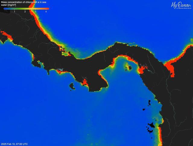 2024年2月巴拿马周边海域叶绿素浓度分布(蓝色=低,红色=高),显示巴拿马湾在典型上升流时期达到生产力峰值。图片来源:亚伦·奥迪亚