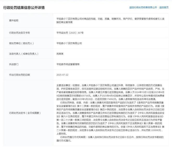 7月22日,平阳县市场监督管理局对平阳县小丫茶饮有限公司做出行政处罚公示,认定该公司对商品的性能、功能、质量、销售状况、用户评价、曾获荣誉等作虚假或引人误解的商业宣传。
