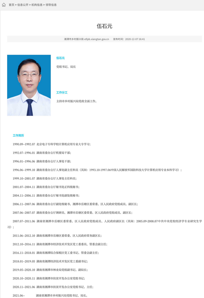 据湘潭市乡村振兴局网站消息,伍石元,男,汉族,1974年1月生,中央党校研究生学历。