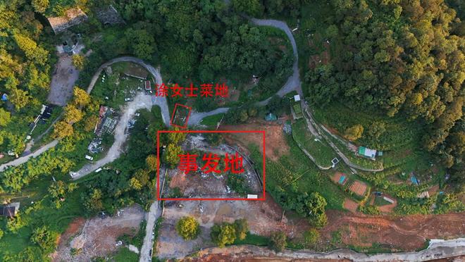 从航拍视角下可以看到,涂女士开垦的菜地就在路边,与事发地相距不足十米,沿着上山的小路前往菜地,周边杂物较多。事发地与周边相比较为平整,且已被围栏围住。