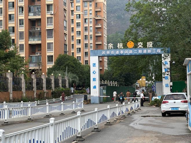记者看到,从闲林中路路口上山的道路一共两道关卡,一个是泰闲路二期道路工程执勤关卡,一个是事发地入口执勤警务人员关卡。