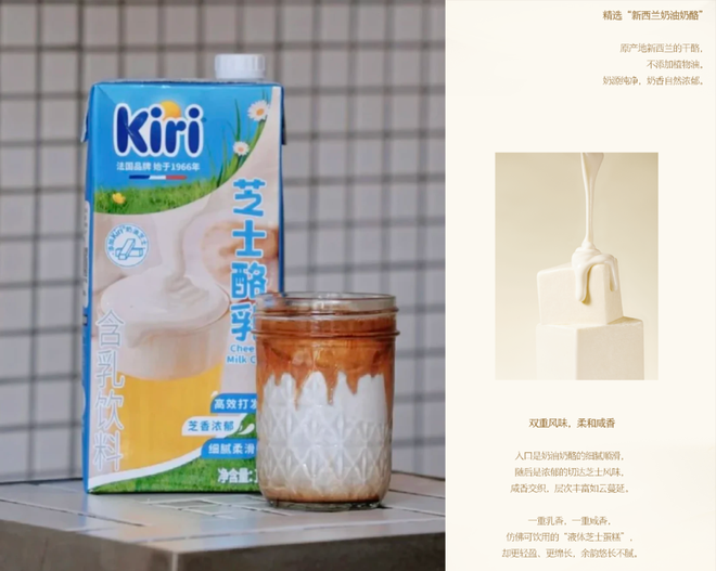 那么法兰西灵魂的直接来源是什么呢?其实讲的是奶酪的出身地,也就是说,最开始的咸法酪,标榜自己用的是来自法国的全球顶级乳制品品牌Kiri的酪乳——据产品宣传,Kiri含高达40%乳脂(普通奶油奶酪约33%),质地如马斯卡彭般绵密柔滑,自带天然发酵的乳酸香,为奶酪顶奠定“丝绒般的醇厚骨架”,其高蛋白低水分的特性,让奶盖即使与冰饮接触也不易消泡,保持稳定的蓬松感。咸法酪的爆火甚至推动了Kiri芝士酪乳的全网断货。