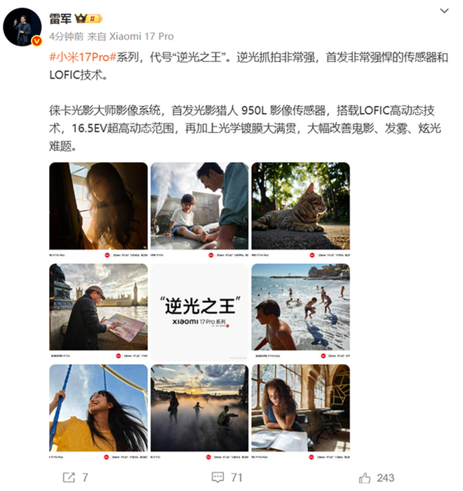 小米17系列发布会定于9月25日前夕,今日雷军在微博上提前曝光了小米17 Pro系列的实拍样张,据雷军介绍,小米17 Pro系列被誉为“逆光之王”,其在逆光条件下的表现非常出色,首发的强悍传感器和LOFIC技术令人期待。