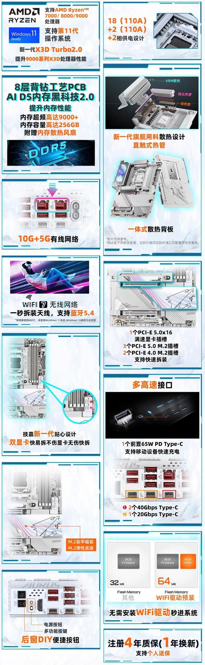 供电方面,主板搭载18(110A)+2(110A)+2相豪华电路,散热装甲内部集成直触式热管,有效降低高负载下的供电模块温度。其核心亮点X3D Turbo2.0技术无需进入BIOS即可一键切换模式,通过AI模型动态优化AMD Ryzen X3D处理器的性能,官方称可提升游戏表现达25%。为保障高频信号稳定性,主板采用8层背钻工艺PCB,并搭载AI D5黑科技2.0技术,最高支持DDR5-9000+内存频率和256GB(4×64GB)容量,还附赠专属内存散热风扇以满足极限超频需求。