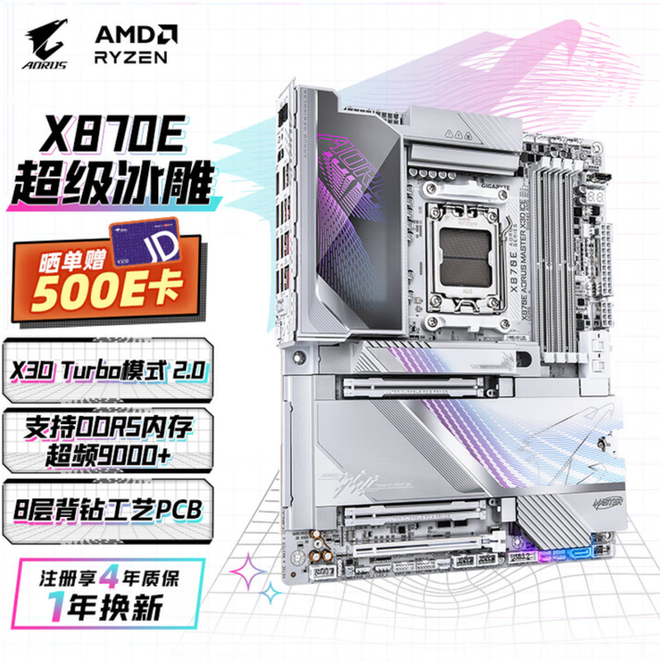 继此前推出电竞冰雕X870E AORUS PRO X3D ICE主板后,技嘉近日在国内电商平台正式上架了更高阶的超级冰雕X870E AORUS MASTER X3D ICE主板。新品延续了纯白外观设计,并进一步强化了散热、快拆与超频性能。目前该款主板已经在国内平台商家开售了,官方售价为4999元。在9月23日至10月15日期间,购买该主板并晒单的用户可获赠500元京东E卡。