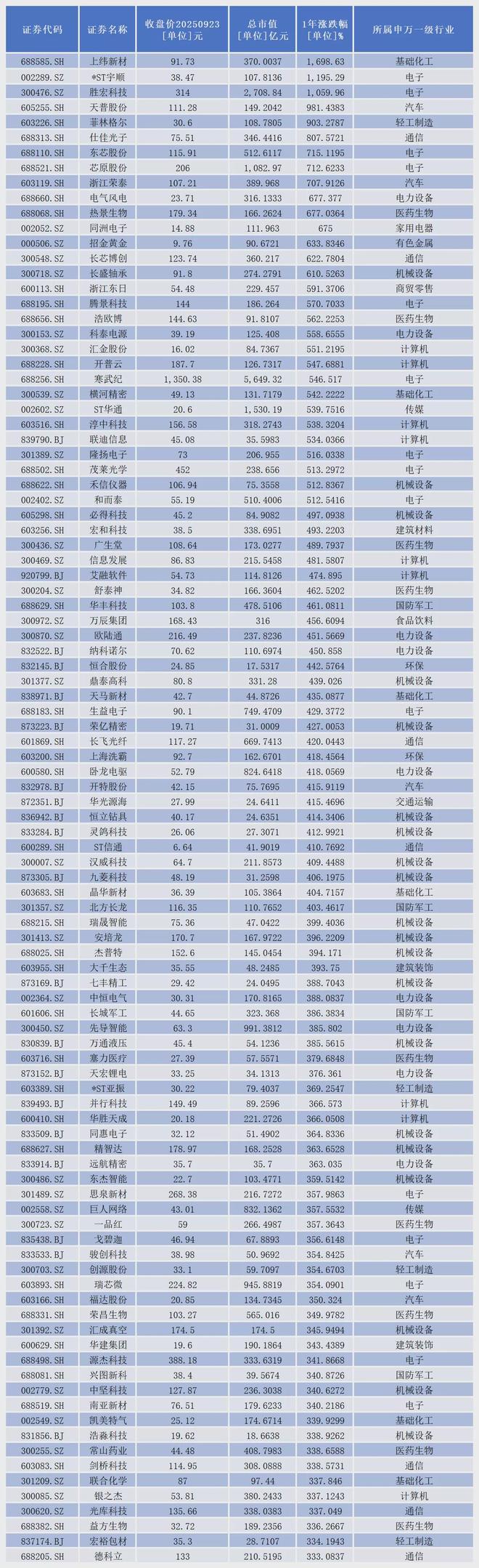 其中,1333家股价成功实现翻倍;30家股价涨幅超过500%,具体包括: