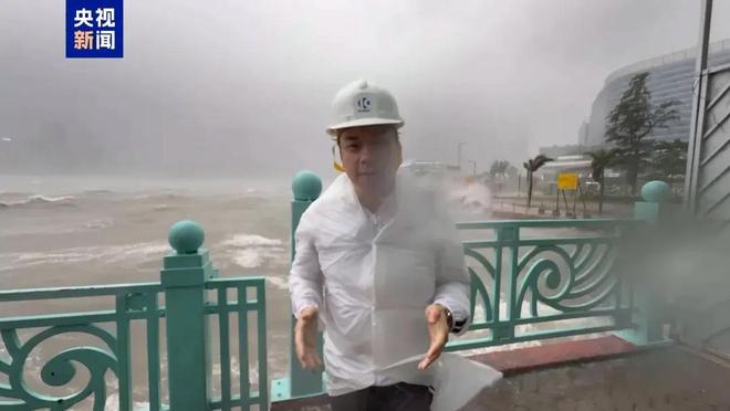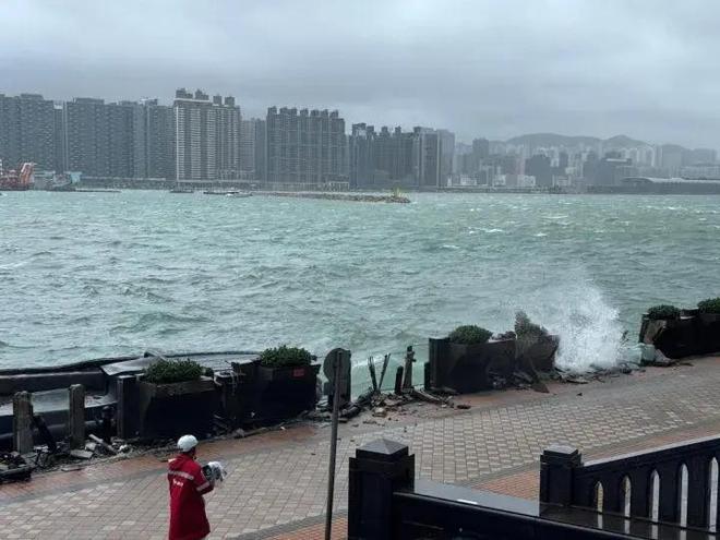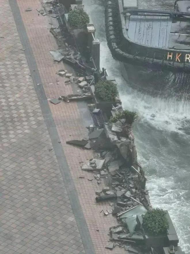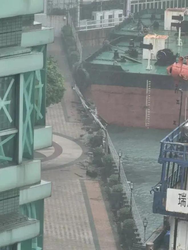 在狂风巨浪下,红磡九龙海逸君绰酒店附近海面发生惊险事故。现场可见,一艘轮船在风浪猛烈下,疑似失控撞向岸边,岸边石栏严重损毁,碎片四散波及行人道。轮船撞击后船身一度紧贴岸边,船锚甩向行人道。