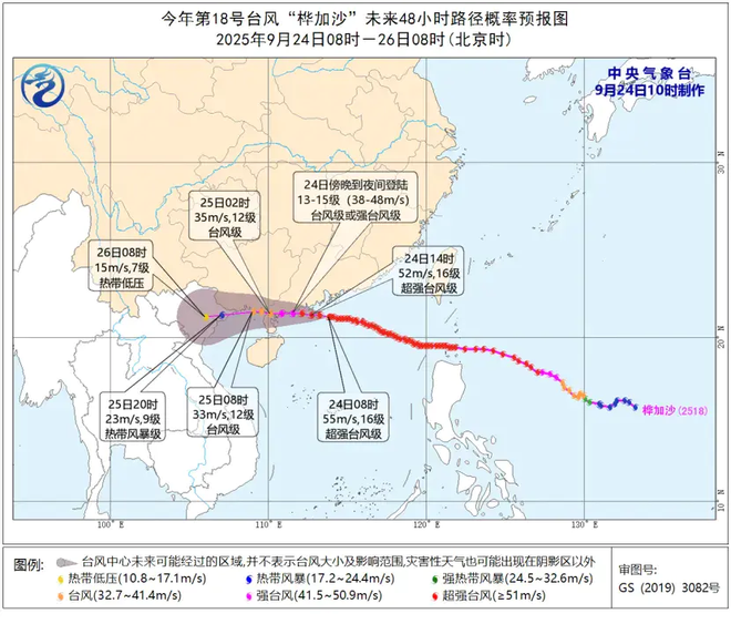 大风预报:24日14时至25日14时,巴士海峡、南海大部、西沙群岛、中沙群岛、南沙群岛、东沙群岛及黄岩岛附近海域、台湾海峡、台湾以东洋面、东海南部、北部湾、琼州海峡、福建南部沿海、广东南部地区及沿海、珠江口区、海南岛沿海、广西沿海将有6-9级大风、阵风10-11级,其中,广东中西部沿海、广西沿海和南海北部的部分海域或地区风力有10-13级、阵风14-15级,台风中心经过的附近海域或地区风力可达14-16级、阵风17级以上。